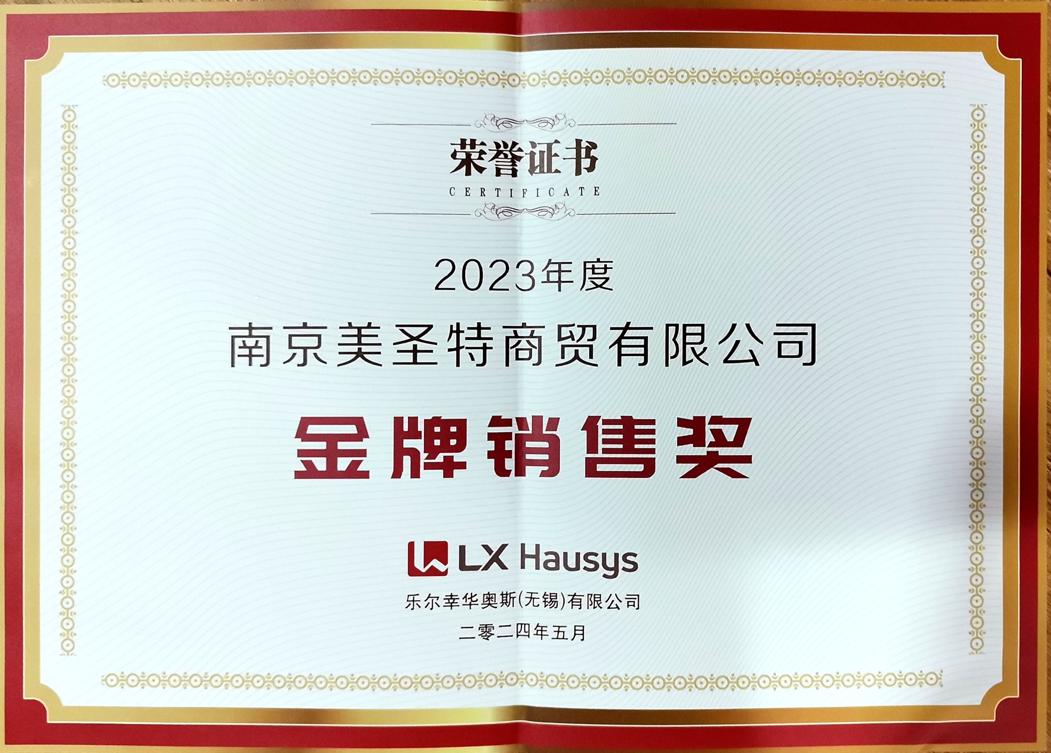 南京美圣特商贸有限公司获得2023年度LX Hausys金牌销售奖